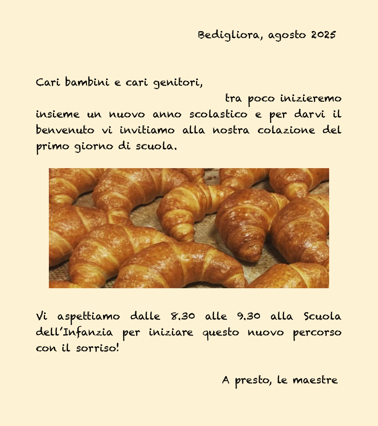 Primo giorno di scuola Le maestre invitano i genitori alla colazione di benvenuto per il primo giorno di scuola. Invito sb_admin2025-08-30T10:01:57+02:0030/08/2025|SI Bedigliora|